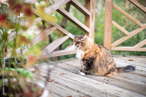 One Calico Maine Coon Cat Sitting Outside On Deck By Wooden Fence