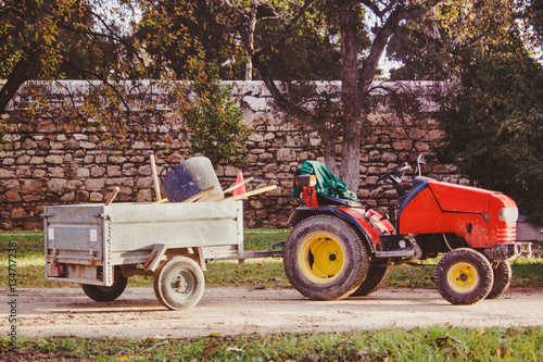 Small Garden Tractor With Trailer And Working Tools Inside In The