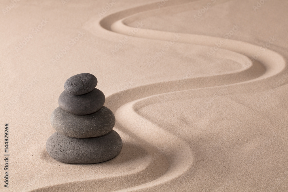 Fototapeten Balancing Black Rocks In Zen Sand Garden Stone Pile